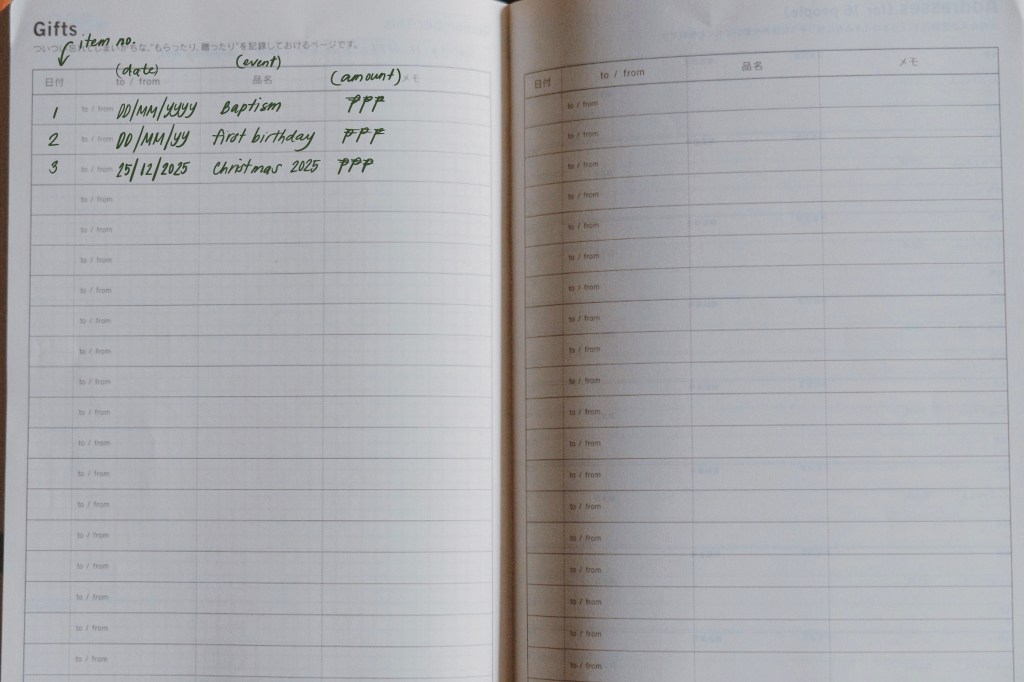 Hobonichi only gives you two pages for gift lists and knowing how enthusiastic people are about giving kids gifts, it is nearly impossible to list most of them in the space provided. Which is why I decided to use this space to track the monetary gifts my son received. I would log the event (baptism, birthdays, christmas) and then place how much he was able to receive in total.
