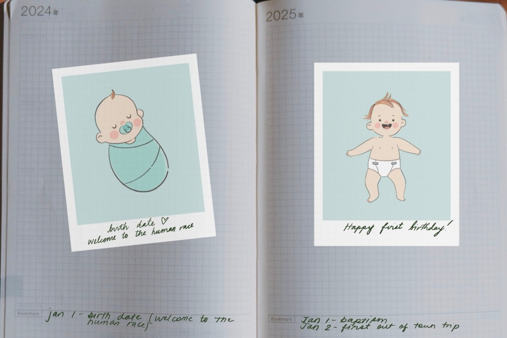 Most ignore the first few pages where a year’s worth of dates are crammed into grid spaces. Upon first glance, there really isn’t much to contribute on your end and it’s always left untouched or unmarked. Luckily for you, time is now your most precious gift. As a new mom it surprised me how much more hyperaware of time I had gotten. Before, I used to look forward to year-ends and new beginnings but now my new year starts with every single month. It overwhelmed me how quickly my baby was growing and changing and what better way to mark those monthly changes by using this calendar spread to document those changes. Whenever the month ends, I would print out his photo as a time stamp of what he looked like that month.
