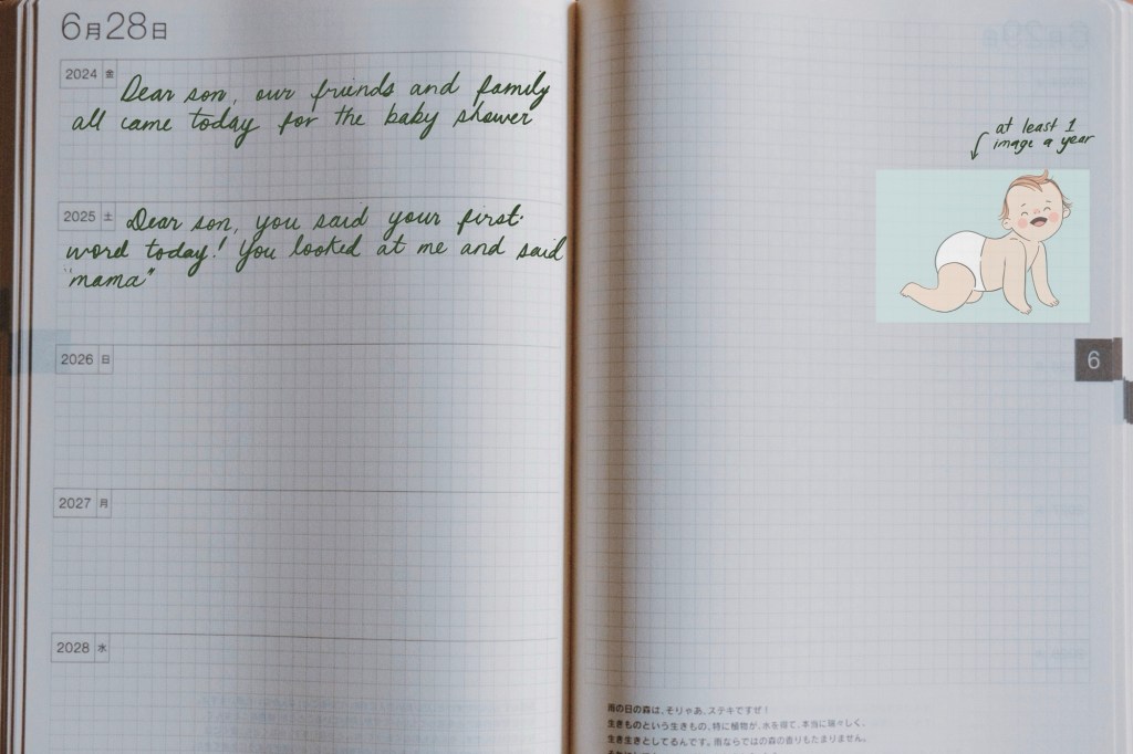 I decided I wanted all of it. I wanted every tiny, minuscule moment logged and stored into safe keeping. Something to remember my journey as a first time mom, as well as remembering my first years with my little one. My only regret was not starting this as soon as I got pregnant cause I personally believe that that’s when being a mom really starts. So, with some luck I was able to hunt down a 2024 Hobonichi 5-year journal (I got pregnant and gave birth last year) and I started where I could, and caught up when I can.