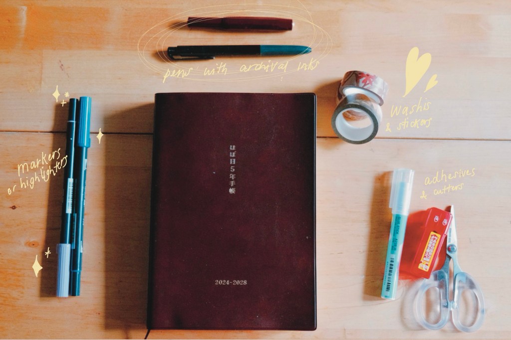 NICE-TO-HAVES: A good glue stick/tape, markers/highlighters to add color, stickers and washi tapes.