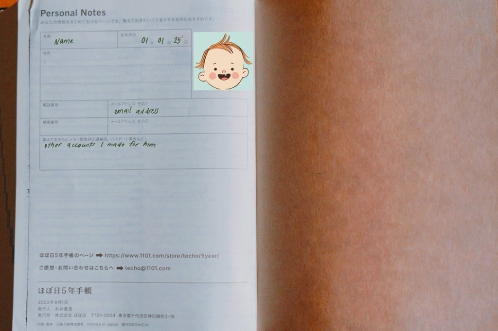 The Hobonichi 5-year journal ends with the personal information page which is basically just the bio data of the journaler. However, I decided to use this page to track my son’s bio data instead, especially to store and note his first email (which was one of the first things I secured for him). Plus I can place his first ever school ID photo there once he starts going to preschool (or his first ever passport photo).